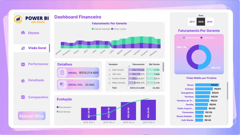 Sabemos que além de DAX complexas, um bom Dashboard tem que ter um Layout Profissional e organizado! Veja alguns do dashboards que você aprenderá a montar em nossas aulas!